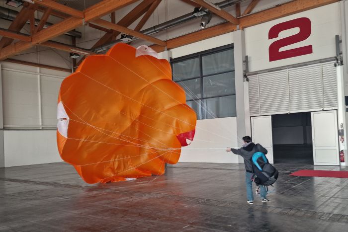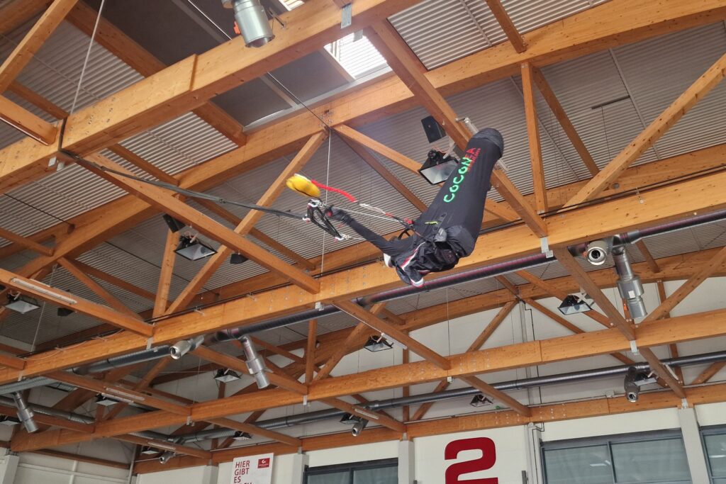 Also ging es diesmal in die Messehalle. Dort wurde ein langes Seil in rund acht Metern Höhe angebracht. Mit einer Hebebühne wurden die Pilotinnen und Piloten samt Gurtzeug nach oben befördert. Spätestens dort wirkte bei manchen das Grinsen dann doch etwas angespannter.